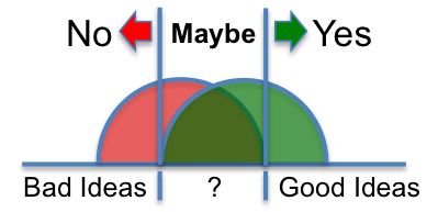 So, what could break this dilemma? Adding MAYBE to the decision mix, of course! Executives (a company, actually) can develop an algorithm that clearly defines new ideas into three categories: NO, MAYBE & YES. The algorithm will take time to develop and maintain for each specific company, but it is achievable. For example, ‘NO’ could be for a situation where the opportunity space is not strategic to the company, the right resources are lacking and there is nothing proprietary to leverage. Note: ‘NO’ should NEVER be used simply because someone thinks the market is too small – that is a measure that simply doesn’t apply to new markets (killing contrarian options as well as invaluable opportunities to learn). ‘Yes’ could be for a situation where there is clear unmet need, great resources to explore in depth, and a proprietary set of assets as advantages. If either factor is lacking or hard to determine, then the idea falls under the Maybe category and should proceed to undergo further diagnosis (neither fast tracked nor killed on the spot).