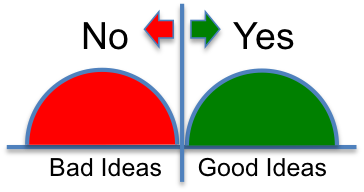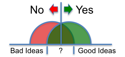 The internal investor school would teach only one lesson, when to say MAYBE. For some reason, when executives are put in a position to make a decision regarding a request for funding for a new idea, they think of themselves as a PSA test, being forced to make a healthy vs. sick call, a YES vs. NO decision (that professedly makes them ‘decisive’, surely a handy trait for climbing the corporate ladder in the ‘known’ business model). Their YES or NO approach implies that world of ideas clearly separates into two discrete halves, Good vs Bad, such as the diagram below. All one has to do is set their cutoff in the middle (normally a Net Present Value (NPV) greater than $0) and voila! No wrong decisions ever taken! This innovation stuff is really easy, at least for the executive, right?