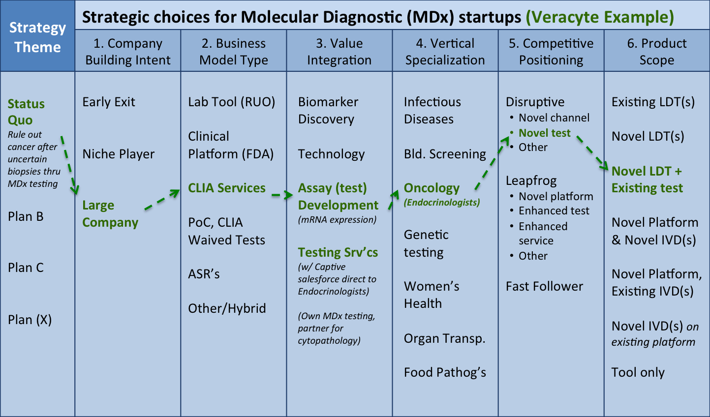 A useful way to conduct a strat plan exercise AS A TEAM is to use a Strategic Choice Canvas tailored to your given industry or market arena, such as the one provided below for the molecular diagnostics space. As in any discussion trying to profit from the various opinions of others, it is useful to draw up different alternatives and discuss their implications before settling on any one pre-determined path and or choosing a hybrid approach. You may also choose to include a couple of tactical choices as integral to the strategic discussion (while you have the right people together including your board advisors), such as the spending focus or shift for the remaining cash, ahead of new rounds of funding.