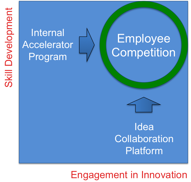 Finally, my favorite, employee competitions – I started this at Qualcomm back in 2005 (The Venture Fest competition). For me, this was the key insight: You want massive employee engagement in innovation? Launch an Idea Collaboration Platform. You want to do a little more and actually develop employee’s innovation skills (not just ideation, but iterative experimentation)? Launch an Accelerator program. You want both in one easy to implement AND to market package? Launch an Employee Competition.
