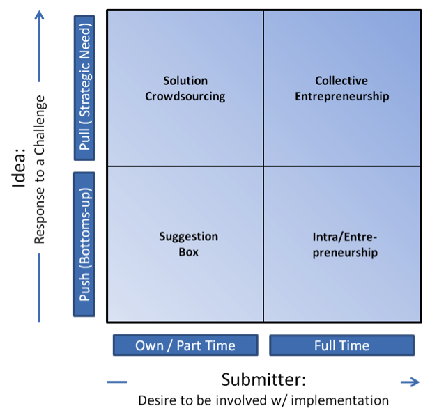 - Collective Entrepreneurship: Ideas solicited as part of a problem or challenge and where sponsors are in principle expecting submitters to participate in implementation activities